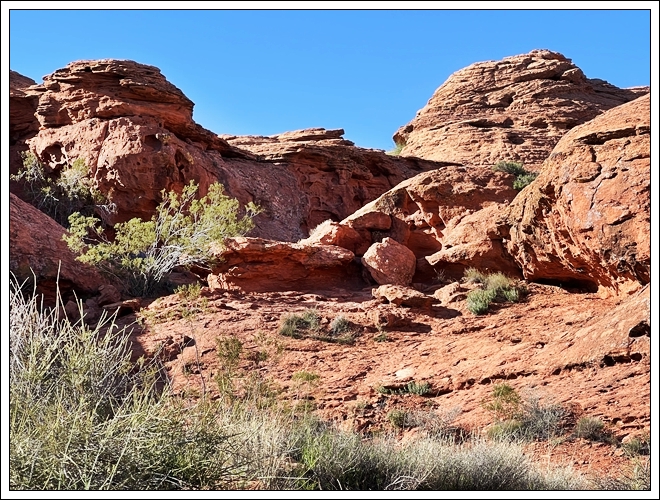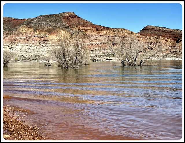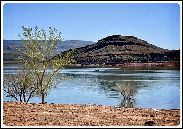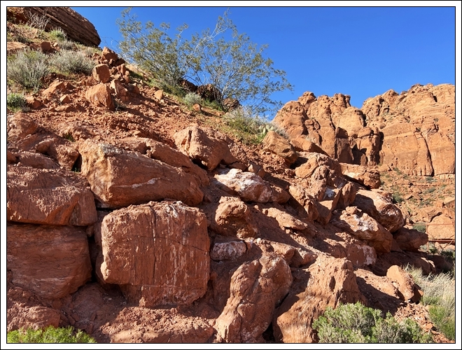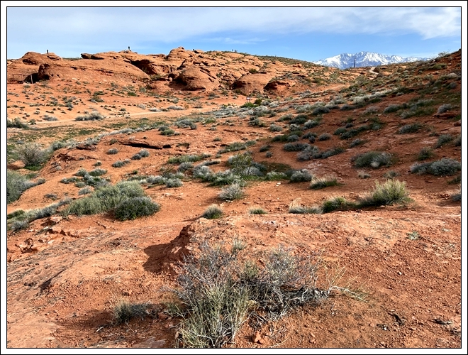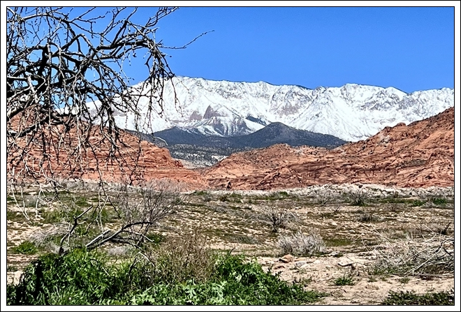 Today we go on an outing with camping neighbors Rick and LeeAnn to Red Cliffs rest area and campground. It is too crowded to park where we can hike in the red rocks, but we park outside and I take photos from the outside vantage point which includes the snow-covered mountain in the background, dark hills in the middle, and red cliffs in the foreground creating interesting layers with a great blue sky beyond.