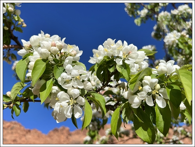 In the afternoon, Clifford and I go on an outing to Tuacahn Ampitheather at St. George. This ampitheater has an amazing setting, being in a earthen bowl surrounded by great red cliffs. Apple trees are blooming, a wonderful contrast to the red rock cliffs and the gorgeous blue sky.