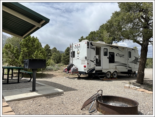 Clifford has enough cell service to call a mechanic in Ely, D&S Repair, and we are scheduled to take it in on Monday – almost a week from now. If we are going to be stuck somewhere, I would have preferred Cave Lake with flush toilets and hot showers, but the advantage here is that the ranger is not likely to care if we have to stay longer at this out-of-the-way park. T-mobile (Clifford’s provider) service is okay here, but no Verizon (my provider). However, I can use Clifford’s phone for communication to stay in touch with family. We get set up, trying not to worry about the issue with the Suburban.