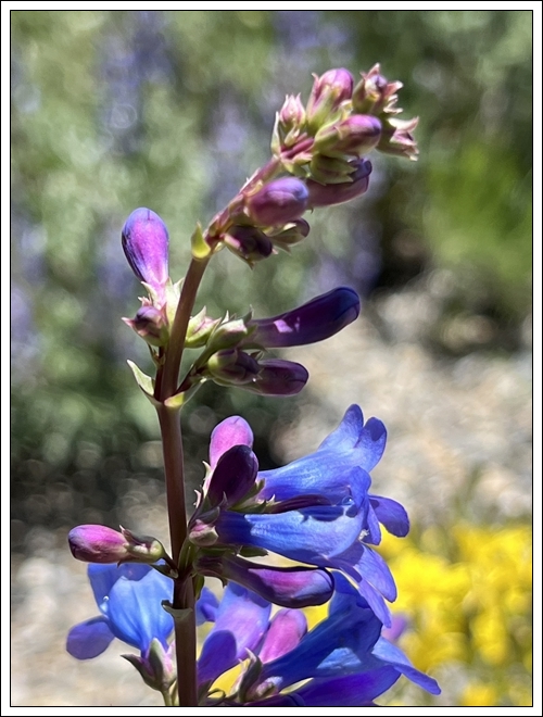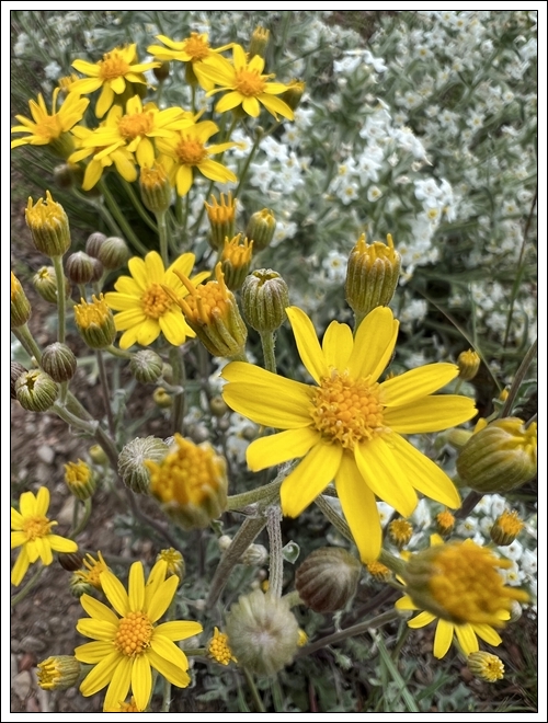 Across the road that encircles the RV sites is a large pit, maybe once a mining claim. I walk there to take photos of wildflowers. It’s a shame that trash is blown or tossed there, as it could be made into a delightful walking path with benches where visitors to the RV park could enjoy a bit of nature.