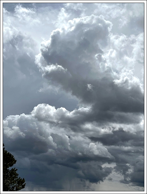 The weather was pleasant when we first arrived, but then there are several days of cloudy, windy, rainy weather, and even hail. One morning we see some sunshine, but just a teaser. It is soon cloudy and windy again. The day before, I kind of wore myself out walking in the wind, trying to find a spot with cell service. Someone has camped at the site right below the bench, so I can’t go there now. So we don’t have much outdoor time, but I’ve been able to do tai chi inside, as well as other indoor projects, like journal writing. Clifford always has projects. We neither one are ever at loss for things to do whether inside or out. On the days that it is too windy for me to do the uphill climb, I get a boost from Clifford’s hotspot.